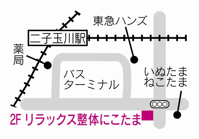 二子玉川改札を出て左に出て、バスロータリーを抜けて「イヌたまネコたま」方面へ信号に面したビル二階。駅改札から1分。
