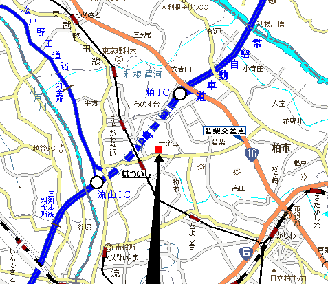 初石駅改札を出て右手の「東武マイン」北側踏切を渡り、徒歩約10分。「ファミリーマート柏西原店」隣のバイク屋角を曲がったところ
